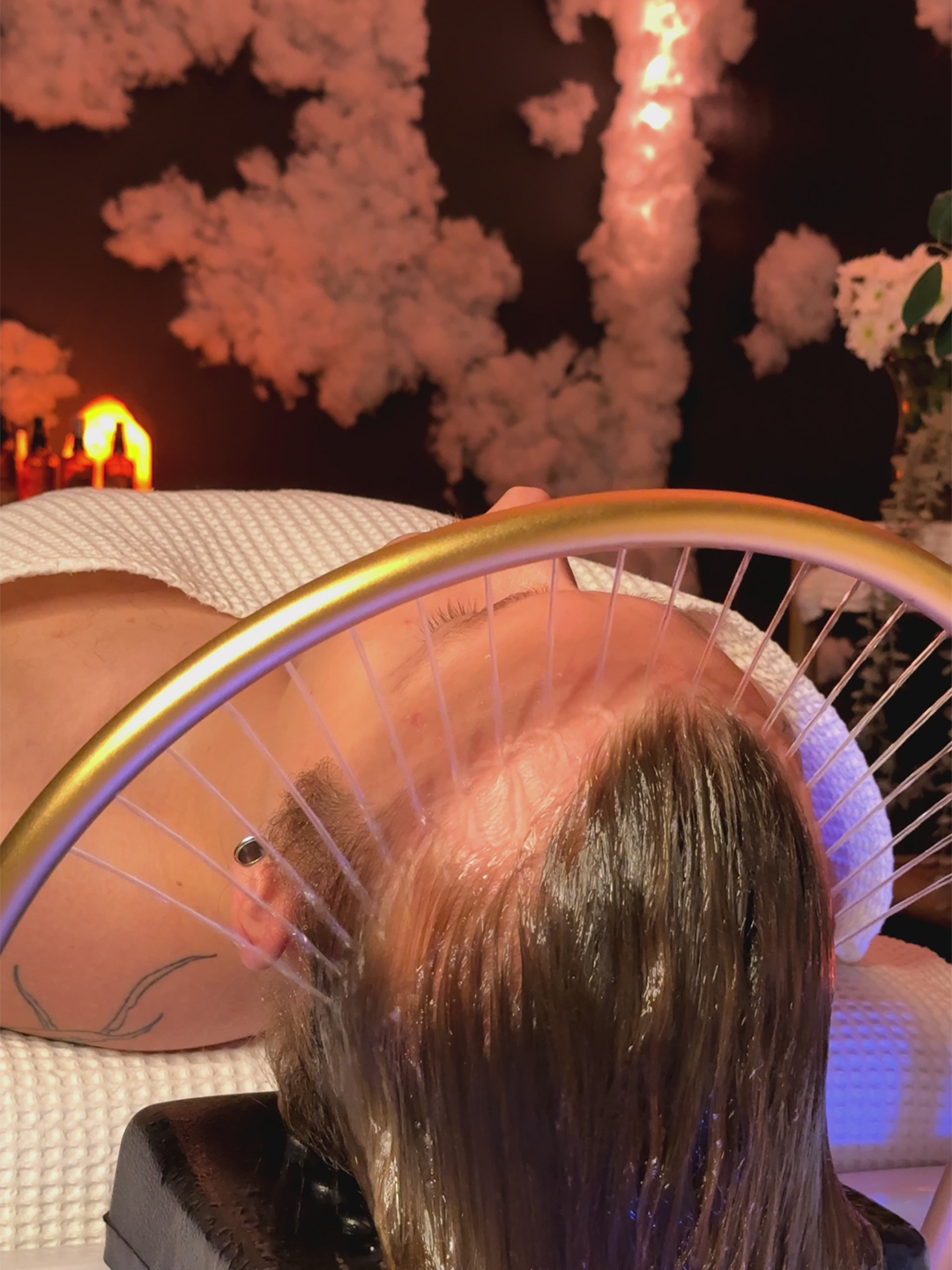 Kiedy będziecie gotowi przejdziemy do rytuału head spa. W sposób równoległy masażystki przeprowadzą cały zabieg zawierający wstęp ASMR, głęboki relaksujący masaż karku, głowy, ramion barków, enzymatyczny peeling oczyszczający skórę głowy, spłukiwanie głowy kołem wodnym, aromaterapię, światłoterapię, saunę na włosy i masaże dłoni lub stóp. Cały rytuał przeplatany jest synchroniczną aromaterapią i efektami dźwiękowymi ASMR.